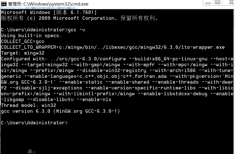 2、用cmd命令提示符输入: gcc -v。如果出现如下信息说明MinGW安装正确。