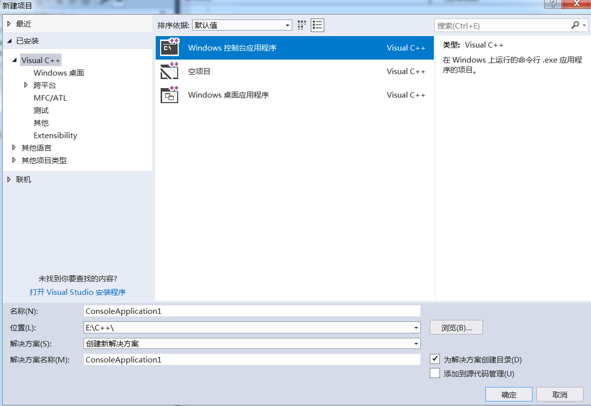 选择Visual C++ -->Windows控制台应用程序 -->名称(N):项目名,位置(L):项目存放位置,填好之后,点击确定,项目就建好了。