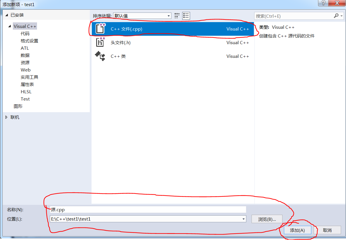 在源文件右击添加-->添加新建项,点击C++文件(.cpp),名称、位置填好,就可以点击确定。