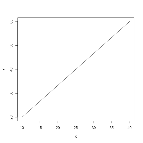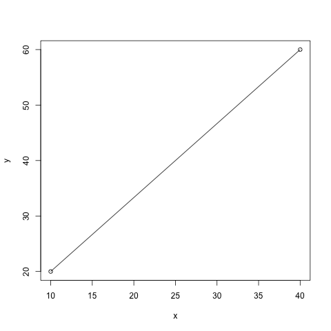 x<-c(10,40) y<-c(20,60) # 生成 png 图片 png(file = "runnob-test-plot2.png") plot(x, y, "l")