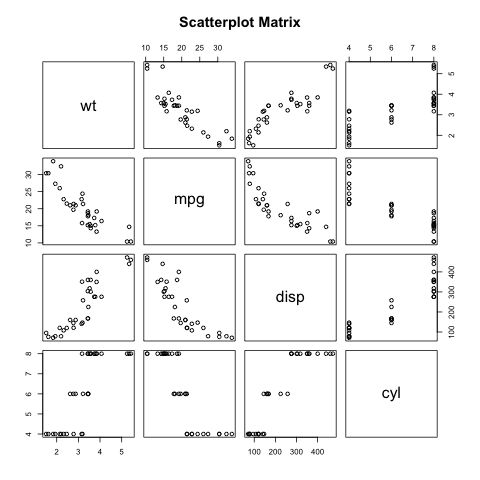 # 输出图片 png(file = "scatterplot_matrices.png") # 4 个变量绘制矩阵,12 个图 pairs(~wt+mpg+disp+cyl,data = mtcars, main = "Scatterplot Matrix")